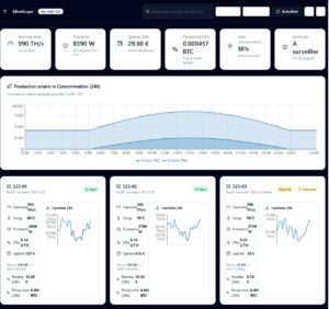 Tableau de bord temps réel : production solaire, consommation électrique des rigs ASIC/GPU, taux d’autoconsommation.